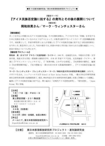 お声がけをいただきまして、2015年7月17日(金)に開催される「第10回差別論研究会・東日本部落解放研究所プロジェクト」にて、マーク・ウィンチェスターさんと一緒に、「『アイヌ民族否定論に抗する』の発刊とその後の展開について」と題した報告を行なうこ…